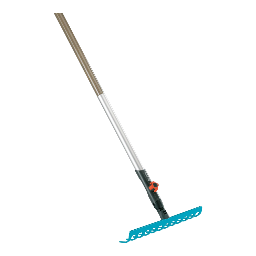 De GARDENA Combisystem hark is veelzijdig toepasbaar voor harken, egaliseren en bodembewerking. De hark heeft een werkbreedte van 30 cm (met 12 tanden).